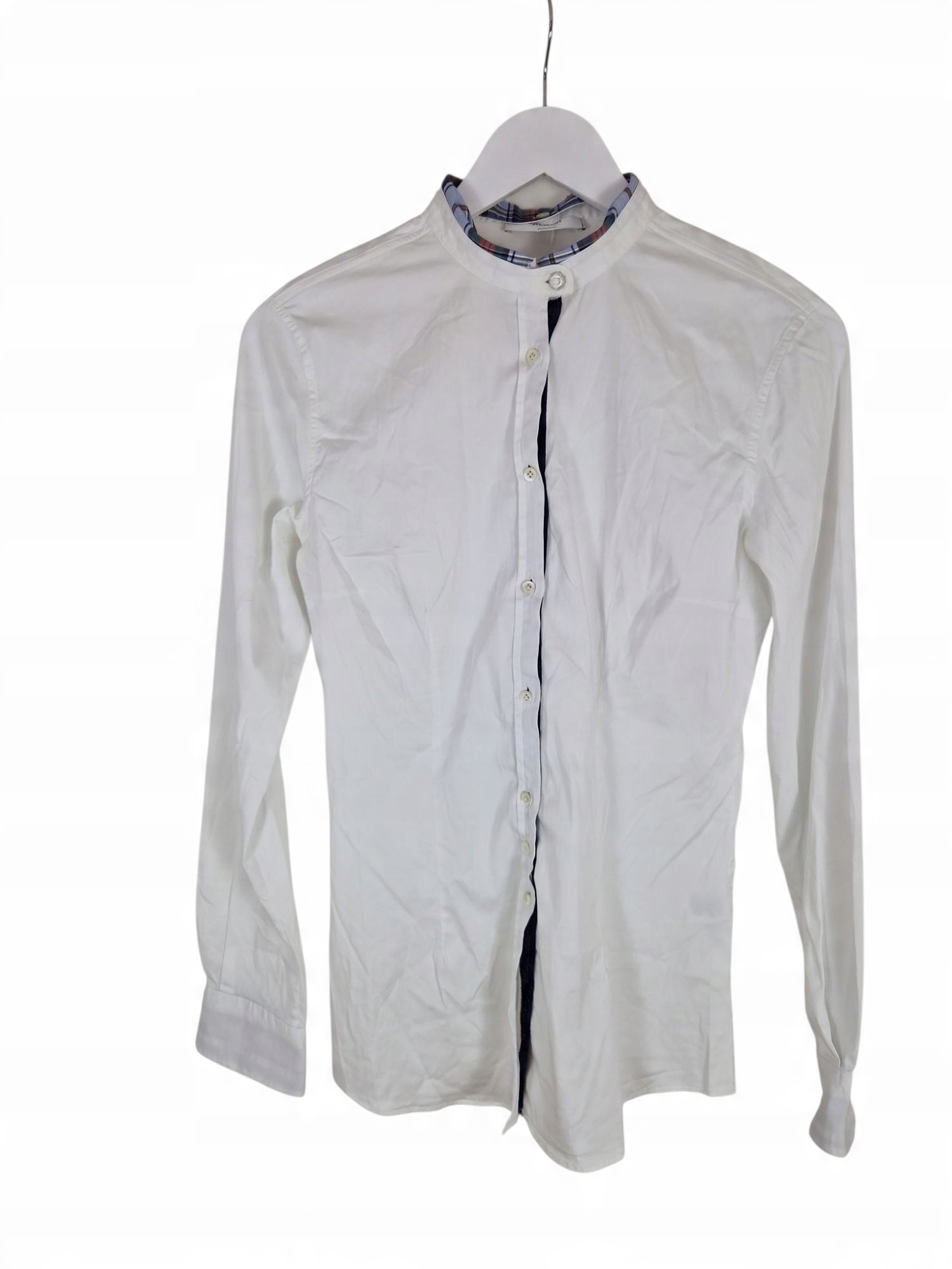 Stan: Używany (bardzo dobry stan, brak widocznych śladów użytkowania czy uszkodzeń) Rozmiar: M Materiał dominujący: Bawełna Kolor: Biały (z kołnierzykiem w kratę)