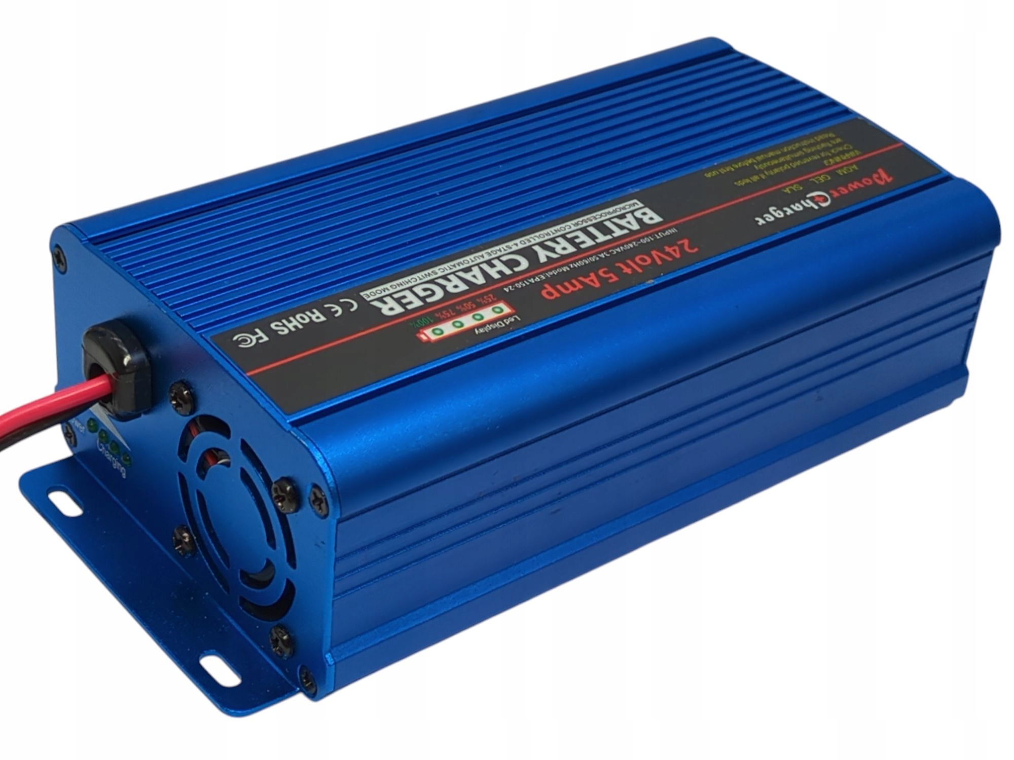 - Format wyświetlania: Diody LED wskazują proces ładowania z wyraźnie widocznymi diodami LED 25%, 50%, 75%, 100%.