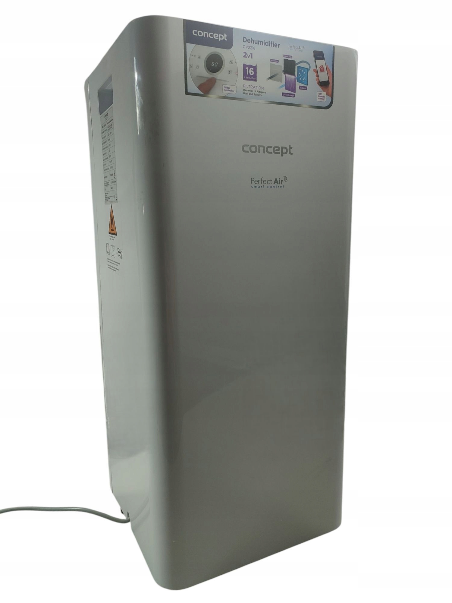 Concept OV2216 Perfect Air Smart to nowoczesny osuszacz powietrza o wydajności do 16 litrów na dobę, który łączy funkcję osuszania i oczyszczania powietrza. Urządzenie jest wyposażone w czterostopniowy system filtracji, obejmujący filtr przeciwpyłowy, filtr węglowy, jonizację oraz lampę UVC, co skutecznie redukuje kurz, alergeny, pyłki, zapachy, gazy i pleśnie, poprawiając jakość powietrza w pomieszczeniu.