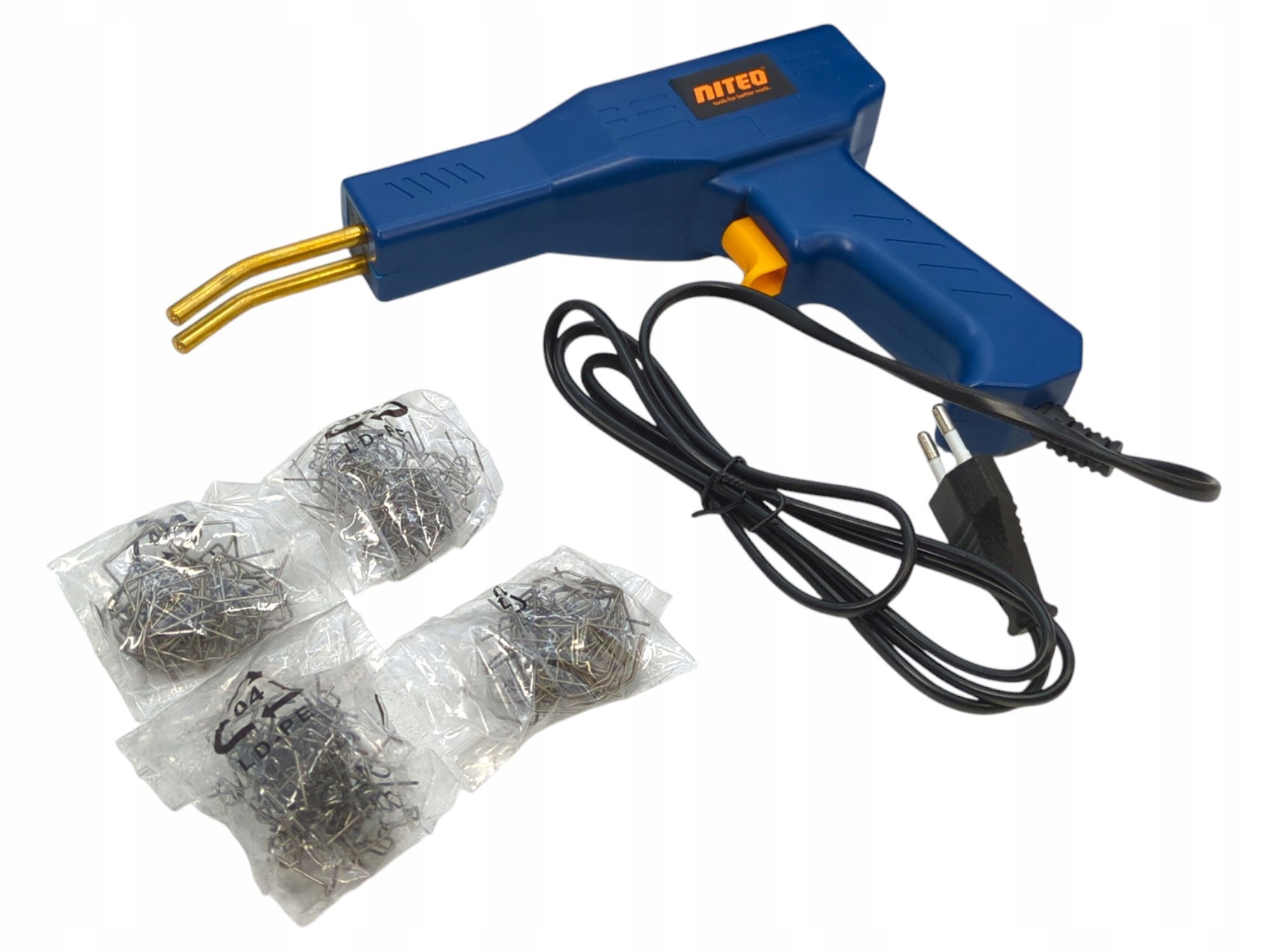 Spawarka do plastiku NITEO wyposażona została w akcesoria oraz 200 zszywek w czterech kształtach do różnych zastosowań. Zszywki proste pomogą Ci naprawić drobne lub proste pęknięcia z nacięciami. Zszywki z grotem rozwartym służą do naprawy pęknięć w narożnikach wewnętrznych. Te z grotem wewnętrznym są idealne do pęknięć zewnętrznych. Z kolei te z grotem w kształcie sinusoidy do naprawiania dużych lub zakrzywionych pęknięć z nacięciami.