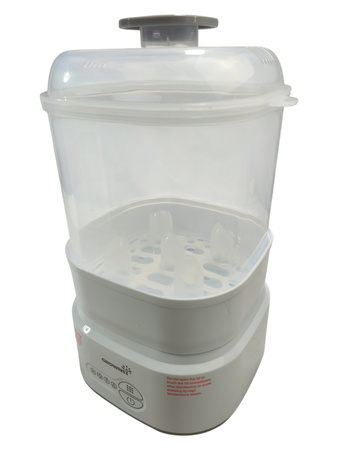- Butelki i akcesoria są otoczone gorącą parą, która dociera do każdego zakamarka. Proces sterylizacji trwa zaledwie 8 minut, co pozwala zaoszczędzić czas i energię.